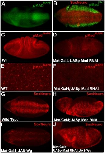 Figure 5. Mad Is Epistatic to Wg Signaling During Neurogenic Induction.(A) Mad was phosphorylated at its MAPK sites in developing CNS neuroblasts. (B) pMadCter was excluded from the neurogenic ectoderm marked by SoxNeuro (stage 8). (C and D) Mad RNAi driven in the egg by pUASp knocked down pMadMAPK staining (stage 7). (E and F) Maternal Mad RNAi knocked down pMADMAPK centrosomal staining (stage 7, see Figure S5 for asymmetric centrosomal staining). (G–J) Mad RNAi increased neurogenic ectodermal nuclei marked by SoxNeuro at stage 8, Wg overexpression reduced it, and the double Wg;RNAi embryos displayed the Mad depletion phenotype. All images were taken at identical exposure conditions. This experiment shows that Mad is epistatic to Wg. |