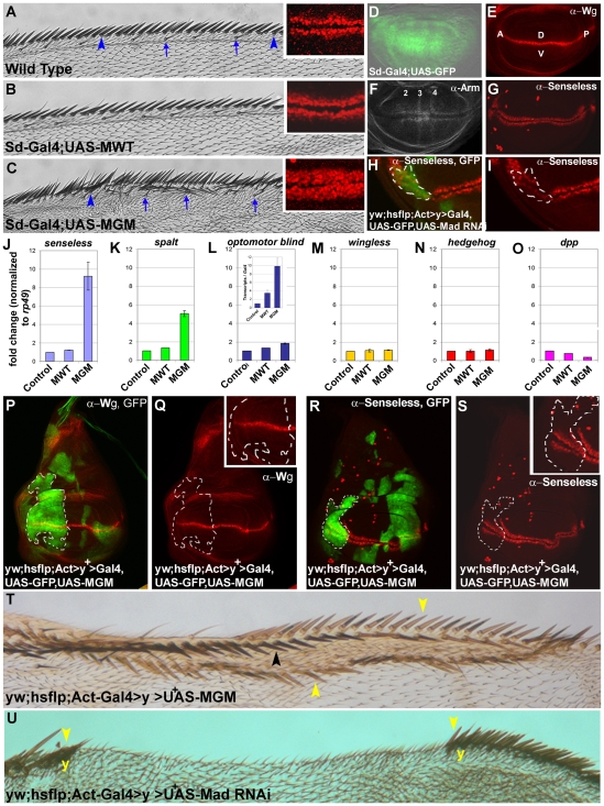 Figure 2. Mad GSK3 Mutants Mimic Wg Overexpression.(A–C) Additional bristles are induced in the wing margin by MGM driven by scalloped-Gal4. Arrows indicate chemosensory bristles and arrowheads stout mechanosensory bristles. Insets show that the number of Senseless-expressing bristle precursors in wing imaginal discs is increased by MGM, but not MWT.(D–G) Expression domains of sd-Gal4 driver, Wg protein, Armadillo stabilized by Wg (expression in the proveins is noted), and Senseless in wing discs. (H and I) Senseless protein expression was inhibited in Mad RNAi clones marked by GFP. (J–O) Quantitative RT-PCR of wing discs showing that MGM increased both a Wg target gene (senseless) and Dpp target genes (spalt and optomotor blind), while not affecting wg or hh levels. dpp was inhibited by MGM RNA. Samples were normalized for rp49, except for the inset in L in which Gal4 mRNA was used. (P and Q) Clonal overexpression of MGM does not change Wg levels. (R and S) MGM clone in the anterior margin causes ectopic expression of Senseless within the clone (inset). (T) Overexpression of MGM in clones marked by yellow induced duplications of the wing margin (n = 24). Yellow arrowheads indicate ectopic margins and a black arrowhead the wild type one. (U) Knockdown of Mad in clones partially eliminates the wing margin In this large clone the remaining margin bristles are yellow (y). |