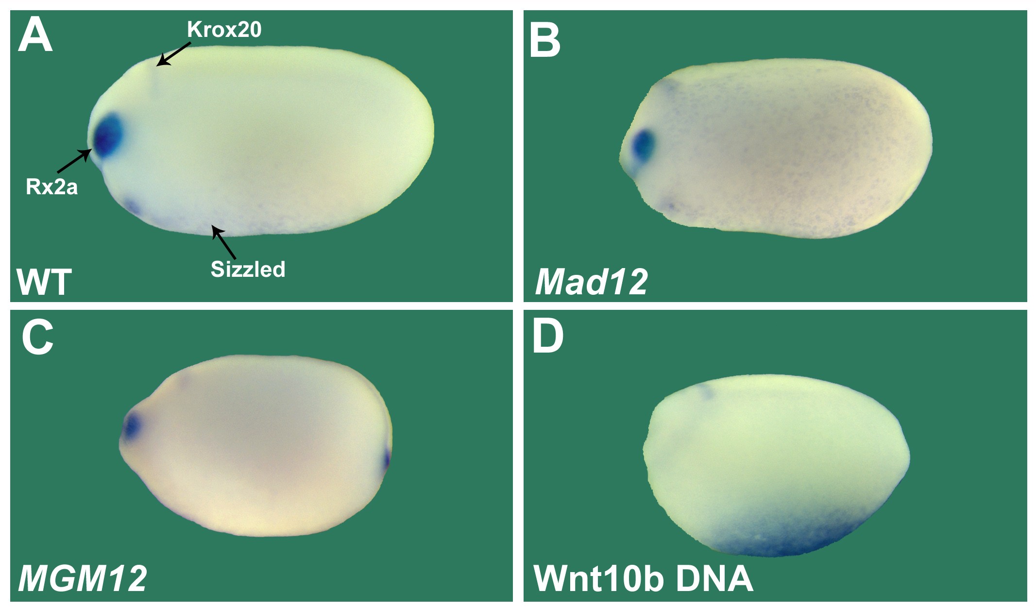 The Mad12 mutant, which lacks the C-terminal phosphorylation sites, retains posteriorizing activity in Xenopus, in particular when the GSK3 sites are also mutated. (A) Whole mount in situ hybridization of tail bud stage Xenopus embryos (n = 16). Embryos are stained for Rx2a (eye), Krox20 (Hindbrain) and Sizzled (Ventral/Belly). (B) Microinjection of Mad12 mRNA reduced the anterior head region of the embryo, indicated by decreased Rx2a expression (n = 15). (C) Elimination of the anterior head structures in MGM12 microinjected mRNAs (mutation of the GSK3 phosphorylation sites mimics Mad receiving a maximal Wg signal) resulted in a severely posteriorized embryo with almost complete loss-of Rx2a expression (n = 13). (D) Similar posteriorized phenotypes are generated when Wnt10b DNA is microinjected into Xenopus embryos. In addition to this, there is an increase in the expression of the BMP responsive gene sizzled, presumably because it affects the stability of endogenous Smad1/5/8 (n = 7). |