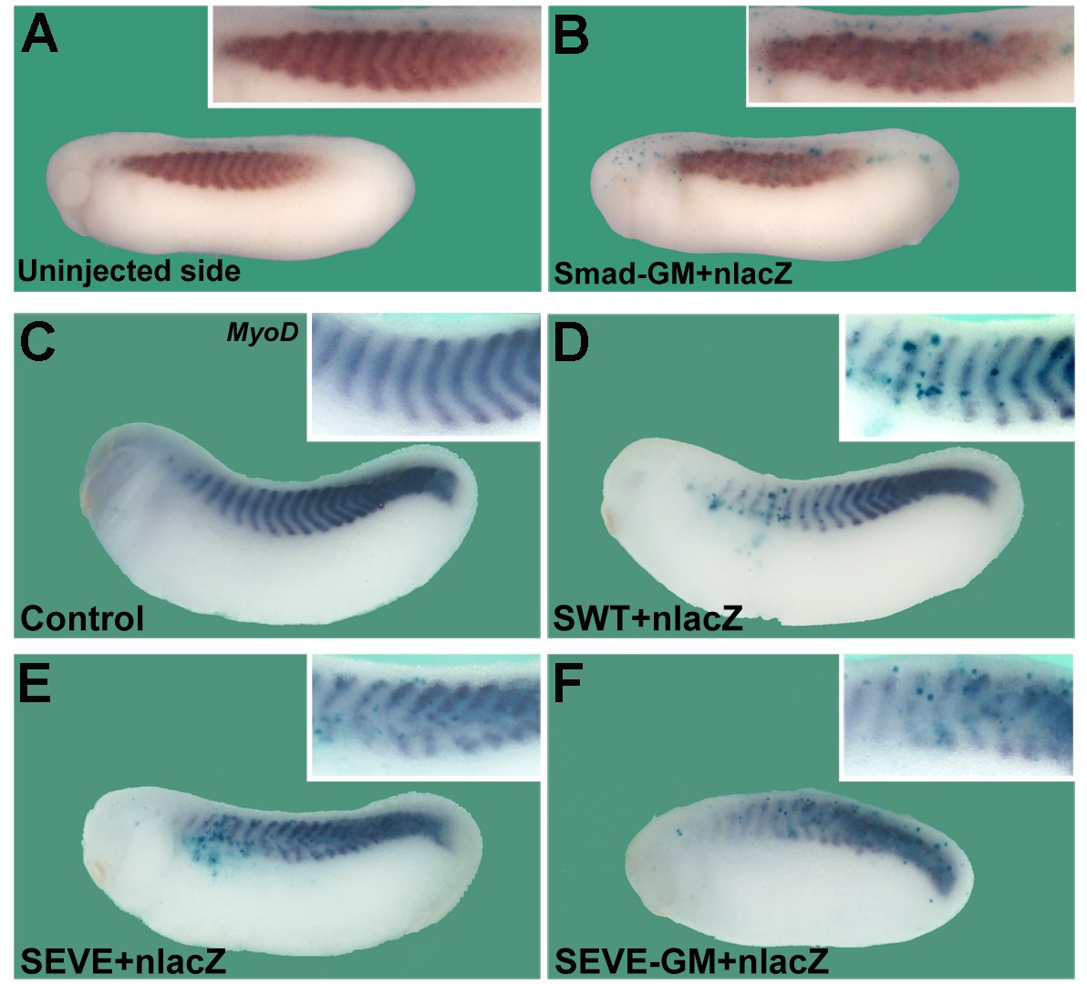 GSK3-resistant Activated Forms of Smad1 Disrupt Segmentation in Xenopus Embryos. (A and B) Immunostainings for myosin light chain showing loss of segmental borders in somites in the injected side (B) of a Xenopus embryo (stage 26), compared to the uninjected side. C2 or C3 blastomeres were injected with 100 pg of hSmad1 resistant to GSK3 phosphorylation [5] and 50 pg of nuclear LacZ mRNA (n = 32/42). (C) In situ hybridizations for the somite marker MyoD shows a disruption of the segmental pattern in Xenopus embryos (stage 30) injected with activated forms of Smad1. Uninjected control embryos express MyoD in the somitic segments in a typical chevron shape (n = 27). Overexpression of Smad1 wild-type mRNA (SWT) does not change this pattern (n = 21). An activated mutant of Smad1 that has phospho-mimetic amino acid substitutions on the C-terminus (the two most c-terminal serines mutated into glutamic acids, designated EVEmutant [5]) displays mild disruptions of the somite pattern (n = 9/12), while the same phospho-mimetic form of Smad1 with an additional mutation in the GSK3-phosphorylation site in the linker (named EVE-GM exhibits strongly impaired segmentation (n = 14/18). Nuclear LacZ marks the injected cells. |