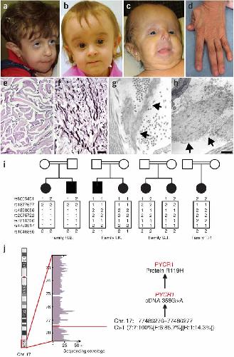 Autosomal recessive cutis laxa (ARCL) describes a group of syndromal disorders that are often associated with a progeroid appearance, lax and wrinkled skin, osteopenia and mental retardation. Homozygosity mapping in several kindreds with ARCL identified a candidate region on chromosome 17q25. By high-throughput sequencing of the entire candidate region, we detected disease-causing mutations in the gene PYCR1. We found that the gene product, an enzyme involved in proline metabolism, localizes to mitochondria. Altered mitochondrial morphology, membrane potential and increased apoptosis rate upon oxidative stress were evident in fibroblasts from affected individuals. Knockdown of the orthologous genes in Xenopus and zebrafish led to epidermal hypoplasia and blistering that was accompanied by a massive increase of apoptosis. Our findings link mutations in PYCR1 to altered mitochondrial function and progeroid changes in connective tissues.