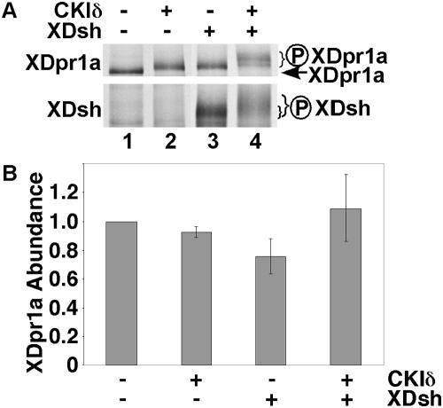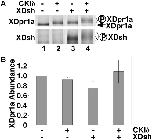 Figure 1. XDsh promotes a CKIδ-mediated mobility shift of XDpr1a.A. XDpr1a exhibits a mobility shift in the presence of CKIδ and XDsh. In vitro transcribed and translated XDpr1a exhibits a mobility shift in the presence of purified CKIδ, and in the presence of in vitro transcribed and translated XDsh. The mobility shift is greater in the presence of both CKIδ and XDsh. XDsh also exhibits a mobility shift in the presence of CKIδ. The XDpr1a mobility shift present in lanes 2 and 3 is likely due to limiting amounts of endogenous XDsh and CKIδ in the reticulocyte lysates used in the in vitro transcription and translation, respectively. B. XDsh-mediated CKIδ phosphorylation of XDpr1a has little effect on XDpr1a abundance. Phosphorylation reactions were carried out as in A., but with the inclusion of luciferase as a loading control. XDpr1a and luciferase bands were quantitated, and the XDpr1a signal was normalized to that of luciferase. The luciferase-normalized signals were then normalized to that of XDpr1a alone. Error bars signify standard deviation (n = 3 trials).