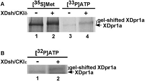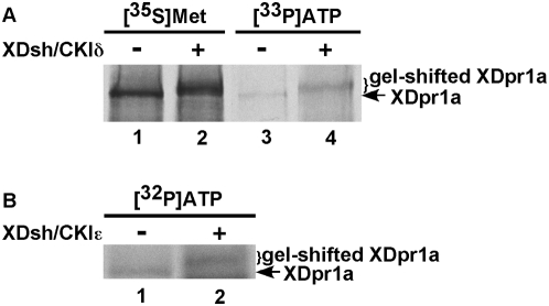 Figure 2. XDsh promotes the phosphorylation of XDpr1a by CKIδ both in vitro and in vivo.A. XDsh induces a CKIδ-mediated phosphorylation of XDpr1a in vitro. Phosphorylation reactions were carried out in the presence of [35S]methionine-XDpr1a (lanes 1 and 2) or [γ-33P]ATP (lanes 3 and 4) and in the absence (lanes 1 and 3) or presence (lanes 2 and 4) of XDsh and CKIδ. Lanes 3 and 4 contain the immunopellet from an anti-Myc immunoprecipiation of [γ-33P]ATP-labeled Myc:XDpr1a. XDpr1a undergoes a gel-shift and shows increased incorporation of [γ-33P]ATP in the presence of XDsh and CKIδ. B. CKIε phosphorylates XDpr1a in vivo. HEK293 cells transfected with Flag:XDpr1a alone or with CKIε and XDsh were metabolically labeled with [32P]orthophosphoric acid prior to XDpr1a immunoprecipitation with anti-Flag antibodies. The cotransfection of CKIε and XDsh with XDpr1a induces a gel-shift and increases [32P]orthophosphoric acid incorporation into XDpr1a. This result is representative of experiments repeated three times with similar results.