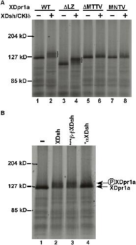 Figure 3. Mutations of XDpr1a or XDsh that block their mutual interaction also block CKIδ-mediated XDpr1 phosphorylation.A. Deletion or mutation of XDpr1a's PDZ-B domain blocks CKIδ-mediated XDpr1a phosphorylation. Deletion of the leucine zipper domain of XDpr1a (ΔLZ), which does not affect its ability to bind XDsh, does not affect the ability of XDpr1a to be phosphorylated by CKIδ, as exhibited by a mobility shift. XDpr1a containing a deletion (ΔMTTV) or a point mutation (MNTV) of its PDZ-B domain is not phosphorylated by CKIδ. The braces in lanes 2 and 4 bracket phosphorylated XDpr1a and ΔLZ, respectively. B. An Asn317Thr Mutation in XDsh's PDZ domain abrogates its promotion of XDpr1a phosphorylation. ***β-βXDsh, which contains Gln272Ala, Ser273Ala, and Glu275Ala mutations in a PDZ domain loop outside of the PDZ-B binding domain, promotes XDpr1a phosphorylation by CKIδ at a level similar to that of wild-type XDsh, while *αXDsh, which contains an Asn317Thr mutation in the PDZ-B binding domain within its PDZ domain, does not.