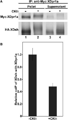 Figure 4. Phosphorylation of XDpr1a and XDsh by CKIδ reduces their interaction.A. Myc-tagged XDpr1a was immunoprecipitated in the presence of HA-tagged XDsh in the absence or presence of CKIδ. The presence of CKIδ reduced the coimmunoprecipitation of XDsh with XDpr1a. B. Quantitation of the relative coimmunoprecipitation (coIP) of XDsh with XDpr. The quantitation of the coimmunoprecipitation of XDsh with XDpr1a revealed that the presence of CKIδ reduced the interaction between XDpr1a and XDsh by approximately one-half when compared to the control. Error bars signify standard deviation.