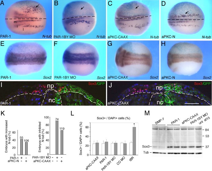 Figure 1. PAR-1 and aPKC Regulate Neurogenesis in Xenopus Embryos(AâH) Four-cell embryos were unilaterally injected with LacZ RNA (50â100 pg) and indicated RNAs or MOs, and subjected to whole-mount in situ hybridization with N-tubulin (AâD) or Sox2 (EâH) anti-sense probes at neurula stages. The injected area is identified by β-galactosidase activity (light blue). Dorsal views are shown, anterior is to the left, and the injected side is at the top. Arrows point to altered gene expression at the injected side. Three stripes of primary neurons (medial, m; intermediate, i; lateral, l) are indicated (A). (A and B) PAR-1 RNA (300 pg, doses are per embryo) increased (A), whereas PAR-1BY MO (5â10 ng) decreased (B), N-tubulin-positive cells on the injected side. (C and D) aPKC-CAAX RNA (30â100 pg) inhibited (C), and aPKC-N RNA (4 ng) expanded (D), N-tubulin-positive cells. (AâD) Dotted lines indicate midline. (EâH) Modulation of PAR-1 and aPKC does not influence the pan-neural marker Sox2 (doses are as in [A]â[D]).(I and J) Phenotypically active doses of PAR-1 ([I], 300 pg) and aPKC-CAAX ([J], 100 pg) RNAs do not alter the number of Sox3-positive progenitor cells. GFP-CAAX RNA was used as a lineage tracer. Stage 15 embryos were cryosectioned and immunostained with anti-Sox3C (red) and anti-GFP-antibodies (green). Dotted lines demarcate neural plate (np) and notochord (nc). Scale bar, 100 μm.(K) Summary of data combined for several independent experiments presented in (A)â(D). Frequency of embryos with a change in N-tubulin-positive cells is shown for each experimental group. Numbers of embryos per group are indicated above bars.(L) Sox3+ progenitor analysis in cryosections. Summary of data for embryos injected with aPKC-CAAX (100 pg), PAR-1 (300 pg), tBR (1 ng) RNAs, and PAR-1BY MO, COMO (5â10 ng). tBR RNA strongly upregulated the number of Sox3-positive progenitors. Mean ratios of Sox3+/DAPI+ cells ± SD are shown. At least 8 embryos were used in each experimental group. *p < 0.01 indicates significant difference from uninjected cells.(M) Lack of effect of PAR-1 and aPKC manipulation on Sox3 protein levels in neurula stage (stage 15) embryos (doses are as in [A]â[D]). BMP7 RNA (500 pg) dramatically reduced Sox3 protein levels. |