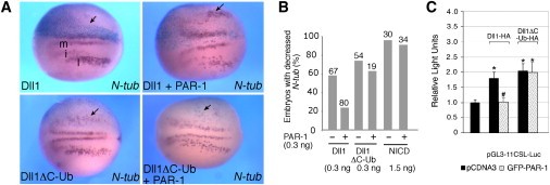 Figure 5. PAR-1 Does Not Affect Signaling of a Mib-Independent Form of Dll1(A and B) Embryos were injected with indicated RNAs and processed for in situ hybridization with N-tubulin probe as described in Figure 1. RNAs were injected at 0.3 ng. Dorsal views are shown, with anterior to the left; the injected side is up (light blue). Arrows point to changes in N-tubulin expression. (A) PAR-1 suppressed the inhibitory effect of untagged Dll1 on neurogenesis, but had no effect on the activity of Dll1δC-Ub. (B) Quantification of PAR-1 effects on Dll1 and Notch signaling is shown. Numbers of embryos per group are indicated above bars. Data are pooled from several independent experiments. RNA doses are indicated per embryo.(C) PAR-1 does not affect Notch reporter activation by Dll1δC-Ub. Signal-sending cells were transfected with PAR-1, Dll1, or Dll1δC-Ub constructs and cocultured with signal-receiving cells that were transfected with Notch and pGL3-11CSL-Luc, as described in Figure 2E. *p < 0.01 and #p < 0.01 indicate significant differences from control- or the Dll1-transfected group, respectively. Results are presented as the means ± SD of three independent experiments, each carried out with triplicate samples per group. |