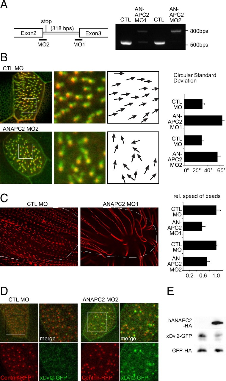 Fig. 5. Depletion of ANAPC2 causes ciliary polarity defects. (A) The efficiency of two nonoverlapping, splice-blocking ANAPC2 MOs was monitored by RT-PCR. (B) The two MOs were injected into the ventral blastomeres to preferentially target the APC/C activity in the Xenopus epidermis. Depletion of Xenopus ANAPC2 caused a randomization of the position of the rootlet, labeled by CLAMP-GFP, in relationship to the basal body, marked by Centrin-RFP. The polarization was quantified by angular measurements of all CLAMP/Centrin pairs in 10 cells; white boxes show the magnified areas, and arrows indicate the direction of the ciliary rootlet in relation to its basal body. Depletion of ANAPC2 by either ANAPC2 MO increased the circular standard deviation compared with that of controls (P < 0.001; error bars represent SEM, n = 10). (C) The randomized polarization of the motile cilia resulted in a significantly reduced speed of fluorescent particles applied to the Xenopus epidermis. Single particles, tracked by Imaris 6.0 software, were depicted as streamlines after superimposing the single frames of video recordings. Broken lines depicted the positions of the embryos. Because of the decreased speed, the streamlines of ANAPC2-MO-injected tadpoles are more punctuated, and the distances between individual dots are smaller (P < 0.05; error bars represent SEM, n > 10). In addition, some particles showed disordered movements and circular trajectories toward the end of the tracked movements. (D) Low levels of xDvl2-GFP (50 pg) were coexpressed with Centrin-RFP (200 pg) in epidermal ciliated cells. Larger magnifications of the boxed area are at right. Channels are separated. In embryos injected with the control (CTL) MO, the xDvl2-GFP signal was barely detectable, whereas xDvl2-GFP formed visible aggregates in Xenopus embryos coinjected with ANAPC2 MO. (E) In whole-embryo lysates, overexpression of human ANAPC2 reduced the steady-state levels of xDvl2-GFP. The RNA coding for xDvl2-GFP and HA-tagged GFP were coinjected without (Left) or with ANAPC2 mRNA (Right) into four-cell-stage embryos. Embryo lysates were prepared at stage 10.5 and analyzed for protein levels by Western blot. Although ANAPC2 reduced xDvl2-GFP levels, the levels of GFP remained unaffected by ANAPC2.