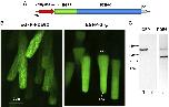 FIGURE 6. Immunoprecipitation and solubilization of PDE6C. A, immunoblotting (WB) with anti-GFP B-2 monoclonal antibody (Santa Cruz Biotechnology, Inc.). Lane 1, retinal extract (0.5 transgenic retina equivalent); lane 2, control immunoprecipitation with unrelated rabbit anti-GST antibody; lane 3, proteins immunoprecipitated from retinal extract (four transgenic retinas) with anti-GFP antibody (ab290, Abcam). Lanes 4 and 5, EGFP standards: 5 and 15 ng of purified E. coli expressed EGFP-PDE6C (446 819). B, immunoblot with anti-PDE6 MOE antibody. Lane 1, transgenic retina extract; lane 2, proteins immunoprecipitated from retinal extract with anti-GFP antibody. C, PDE6 activity of the immunoprecipitated proteins from non-transgenic (left bars) and transgenic (right bars) extracts prior to and following trypsin treatment was measured using 200 ï°M [3H]cGMP. D, after immunoprecipitation of EGFP-PDE6C with anti-GFP-antibody, the beads were treated with trypsin for 15 min. Proteins released into the soluble fraction were separated from the beads, reconstituted with soybean trypsin inhibitor, and analyzed by immunoblotting with anti-PDE6 MOE antibody. This research was originally published in The Journal of Biological Chemistry. Muradov et al âCharacterization of human cone phosphodiesterase-6 ectopically expressed in Xenopus laevis rods.â The Journal of Biological Chemistry, November 20, 2009; 284 (47): 32662-32669. © The American Society for Biochemistry and Molecular Biology. Reproduced with permission. |