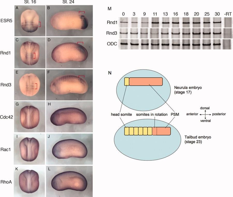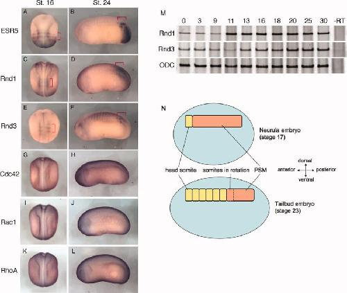 Figure 1. The expression of Rho GTPase family in Xenopus embryos. A-L: Embryos at neurula (A,C,E,G,I,K) or tail bud stages (B,D,F,H,J,L) were stained in whole-mount for the expression of ESR5 (A,B), Rnd1 (C,D), Rnd3 (E,F), Cdc42 (G,H), Rac1 (I,J), and RhoA (K,L). Red brackets in A-F show specific expression patterns of genes indicated. A,C,E,G,I,K: Embryos are oriented with anterior to the top, and dorsal views are shown. B,D,F,H,J,L: Embryos are oriented with anterior to the left, dorsal to the top, and lateral views are shown. M: Rnd1 and Rnd3 mRNA expressions at the different stages were detected by reverse transcriptase-polymerase chain reaction (RT-PCR). ODC (ornithine decarboxylase) was used as loading control. The numbers indicated on the top show staging of Xenopus embryo according to Nieuwkoop and Faber (1967). -RT, without reverse transcriptase. N: Schematic diagram shows Xenopus somitogenesis in neurula (Stage 17) and tail bud (stage 23) embryos (refer to Hausen and Riebesell, [1991]). |