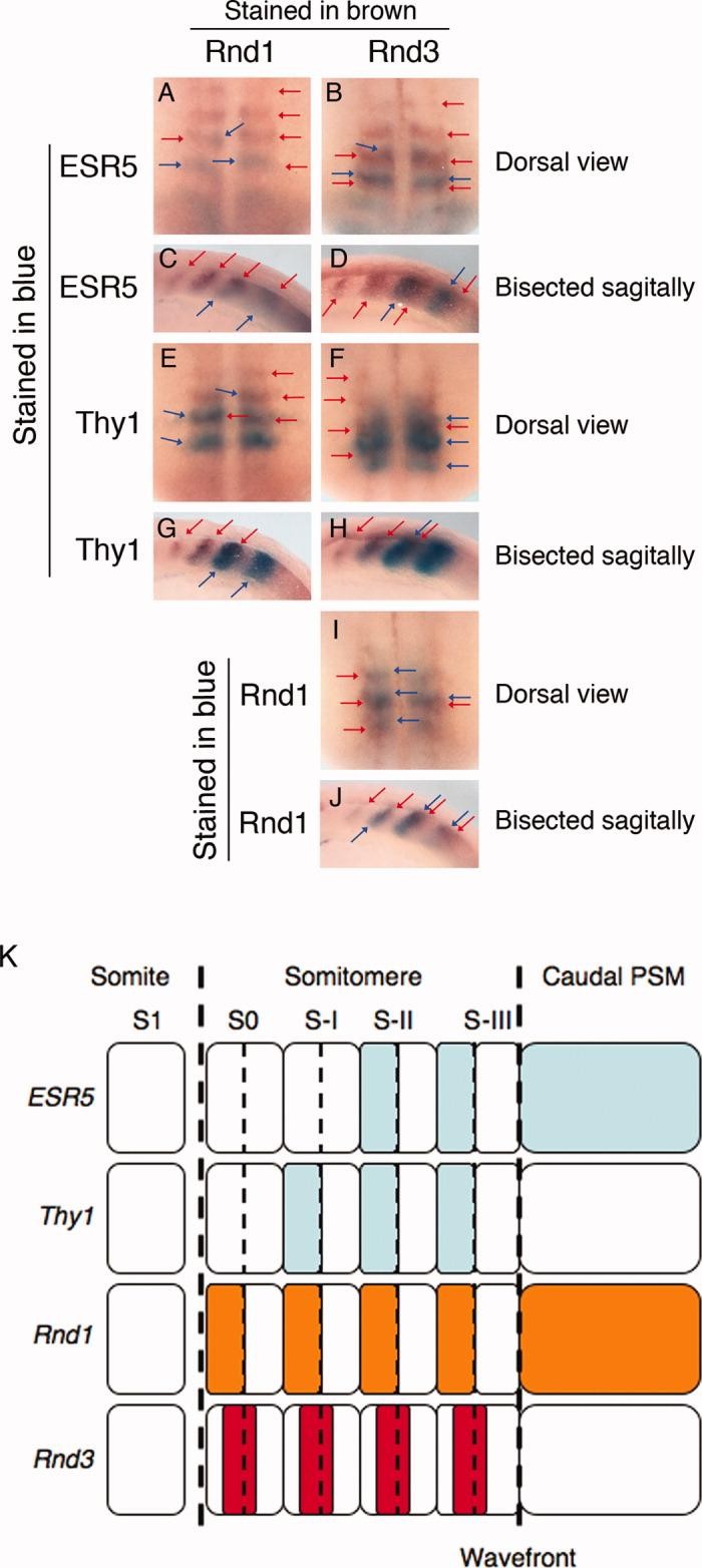 Figure 2. Comparison of expression domains between Rnd1/3 and Notch signal components at somitomeres. A-J: Embryos at neurula stage were double-stained in whole-mount with digoxigenin (DIG) -labeled probes of Rnd1 (A,C,E,G) or Rnd3 (B,D,F,H-J) and fluorescein-labeled probes of ESR5 (A-D), Thy1 (E-H), or Rnd1 (I,J). After staining, embryos were bisected sagittally (C,D,G,H,J). Red arrows show expression domains of DIG-labeled Rnd1 or Rnd3, and blue arrows show expression domains of fluorescein-labeled ESR5, Thy1, or Rnd1. Embryos are oriented with anterior to the top (A,B,E,F,I) or left (C,D,G,H,J). Dorsal views (A,B,E,F,I) and sectional lateral views (C,D,G,H,J) are shown. K: Schematic diagram shows expression domains of ESR5, Thy1 (both are stained in blue), Rnd1 (stained in orange), and Rnd3 (stained in red) at Xenopus neurula stage. S1, most posterior somite; S0-SIII, somitomeres from anterior to posterior. Each somitomeres are divided into anterior and posterior half by dot lines. |