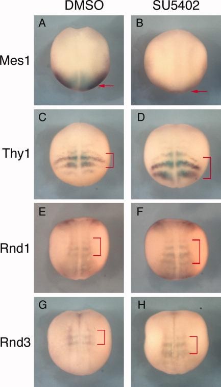 Figure 4. Posteriorly shift of Rnd1 and Rnd3 expression domains by fibroblast growth factor (FGF) inhibitor SU5402. A-H: Stage 14 embryos were incubated with (B,D,F,H) or without (A,C,E,G) 50 mu M SU5402 for 3.5 hr, and stained in whole-mount for the expression of Mes1 (A,B), Thy1 (C,D), Rnd1 (E,F), and Rnd3 (G,H). Red arrows or brackets show expression of genes indicated. All embryos are oriented with anterior to the top, and dorsal views are shown. |