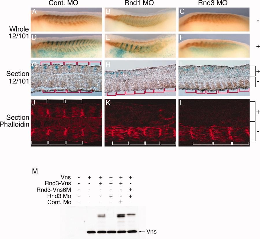 Figure 5. Gene depletion of Rnd1 and Rnd3 disrupted somite formation. A-L: Antisense morpholino oligonucleotide (MO) for control (A,D,G,J), Rnd1 (B,E,H,K), or Rnd3 (C,F,I,L) was injected on one side of the four-cell stage embryos with nlacZ mRNA. At tail bud stage, all embryos were stained in blue with X-gal. A-F: Embryos were stained in whole-mount with monoclonal 12/101 antibody. A-F: Lateral views of noninjected side (A-C) and MO plus nlacZ injected side (D-F) are shown. G-I: Embryos were stained in longitudinal tissue section with monoclonal 12/101 antibody. Red brackets show each somitic unit. J-L: Embryos were stained in longitudinal tissue section with phalloidin. White brackets show each somitic unit. All images are positioned with anterior to the left. G-L: MO plus nlacZ injected side to the top and noninjected side to the bottom (indicated by + and -, respectively), and dorsal views are shown. M: The effect of Rnd3 MO on Rnd3 mRNA transcription was tested with in vitro transcription/translation system. Rnd3 MO inhibited the Rnd3-Vns transcription constructed to generate a fusion protein with eYFP (Vns) specifically, but not inhibited a rescue construct Rnd3-Vns6M. Vns was used as loading control. |