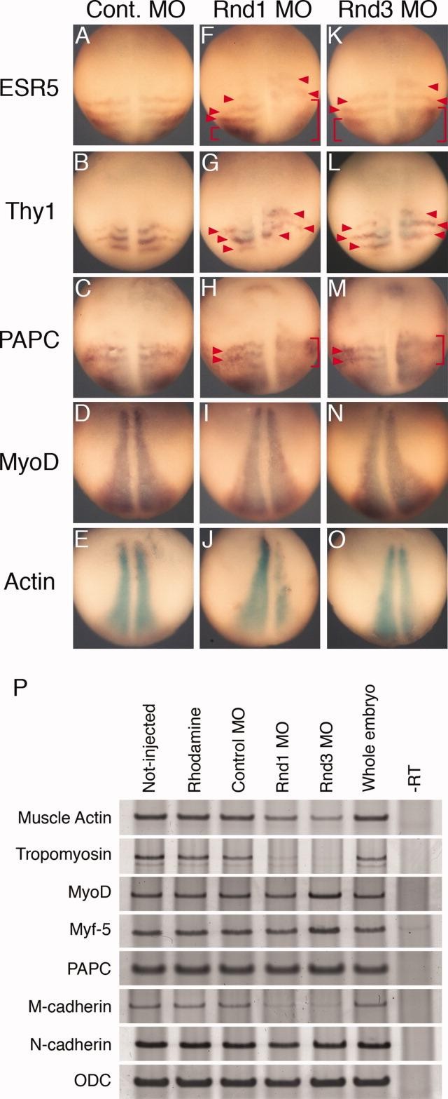Figure 6. Expression patterns and levels of segmentation clock- and somite differentiation-related genes in Rnd1 or Rnd3 morpholino oligonucleotide (MO) injected embryos. A-O: Control (A-E), Rnd1 (F-J), or Rnd3 (K-O) MO was injected on one side of the four-cell stage embryos with green fluorescent protein (GFP) mRNA. Neurula stage embryos were stained in whole-mount for the expression of ESR5 (A,F,K), Thy1 (B,G,L), PAPC (C,H,M), MyoD (D,I,N), and actin (E,J,O). Red arrowheads or brackets show striped or nonstriped domains of each gene expression, respectively. All images are positioned with anterior to the top, MO and GFP mRNA injected side to the right, and dorsal views are shown. P: Embryos injected with control, Rnd1, or Rnd3 MO were analyzed by reverse transcriptase-polymerase chain reaction (RT-PCR) for gene expression levels indicated at the left column. OCD was used as loading control. Rhodamine was injected in embryos with MOs as a lineage trace. -RT, without reverse transcriptase. |