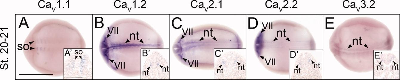 Figure 1. Spatial expression patterns of VGCC alpha 1 subunits in stage 20-21 (neurula) Xenopus laevis embryos using whole-mount in situ hybridization. Embryos were viewed dorsally, with anterior to the left. A,A prime : CaV1.1 expression. B,B prime : CaV1.2 expression. C,C prime : CaV2.1 expression. D,D prime : CaV2.2 expression. E,E prime : CaV3.2 expression. Arrowheads indicate regions of expression. nt, neural tube; so, somite; VII, cranial placode VII, geniculate (facialis) placode. Scale bar = 1.0 mm in A-E; 0.25 mm in A prime -E prime . |