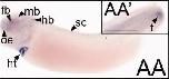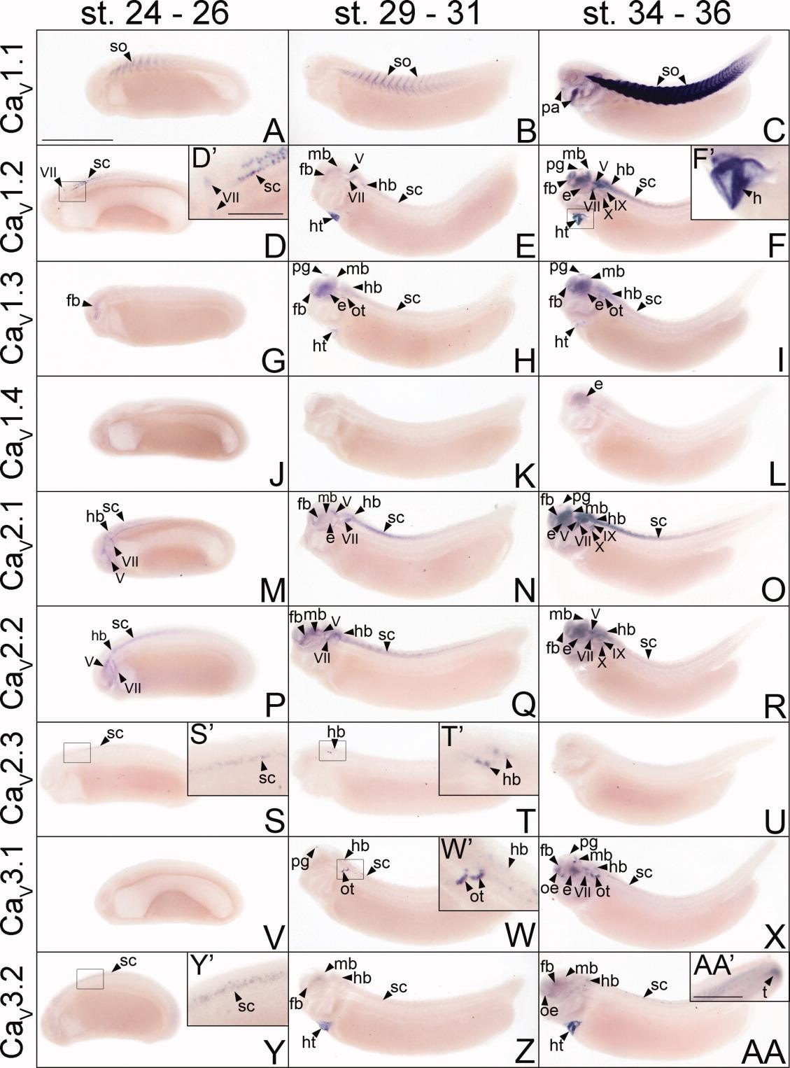 Figure 2. Spatial and temporal expression patterns of VGCC alpha 1 subunits in developing X. laevis embryos using whole-mount in situ hybridization. Embryos were viewed laterally, with anterior to the left and dorsal to the top. A,D,G,J,M,P,S,V,Y: Stages 24-26 (early tail bud). B,E,H,K,N,Q,T,W,Z: Stages 29-31 (late tail bud). C,F,I,L,O,R,U,X,AA: Stages 34-36 (swimming tadpole). A-C: CaV1.1 expression. D-F: CaV1.2 expression. G-I: CaV1.3 expression. J-L: CaV1.4 expression. M-O: CaV2.1 expression. P-R: CaV2.2 expression. S-U: CaV2.3 expression. V-X: CaV3.1 expression. Y-AA: CaV3.2 expression. D prime ,F prime ,S prime ,T prime ,W prime ,Y prime : Magnified images of portions of the embryos indicated by the hollow boxes. AA prime : Magnified image of the tail of an embryo at swimming tadpole stage showing CaV3.2 expression. Arrowheads indicate regions of expression. fb, forebrain; e, eye; hb, hindbrain; ht, heart; mb, midbrain; oe, olfactory epithelium; ot, otic vesicle; pa, pharyngeal arches; pg, pineal gland; sc, spinal cord; so, somite; t, tail bud; V, cranial ganglion V, trigeminal ganglion; VII, cranial ganglion VII, geniculate (facialis) ganglion; IX, cranial ganglion IX, glossopharyngeal ganglion; X, cranial ganglion X, vagal ganglion. Scale bars = 1.0 mm in A-AA, 0.4 mm in AA prime ; 0.2 mm in D prime ,F prime ,S prime ,T prime ,W prime ,Y prime . |