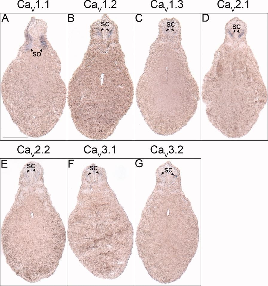 Figure 6. Spinal cord histological analysis of voltage-gated calcium channel (VGCC) alpha 1 subunit expression in stages 35-37 (swimming tadpole) Xenopus laevis using whole-mount in situ hybridization. A-G: Transverse 18- mu m sections within the spinal cord region of the anterior-posterior axis, with dorsal to the top. A: CaV1.1 expression. B: CaV1.2 expression. C: CaV1.3 expression. D: CaV2.1 expression. E: CaV2.2 expression. F: CaV3.1 expression. G,H: CaV3.2 expression. Arrowheads indicate regions of expression. Abbreviations: sc, spinal cord; so, somite. Scale bar = 0.25 mm. |