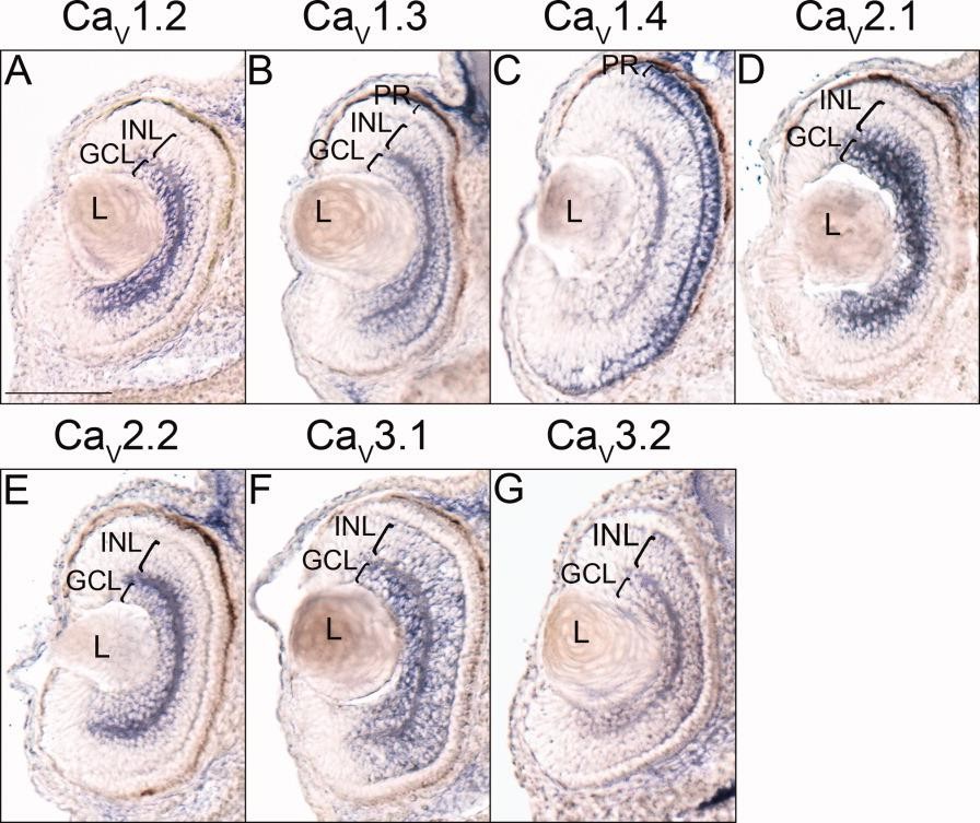 Figure 7. Retina histological analysis of voltage-gated calcium channel (VGCC) alpha 1 subunit expression in stage 40 (swimming tadpole) X. laevis using whole-mount in situ hybridization. A-G: Transverse 18- mu m sections of the retina, with dorsal to the top. A: CaV1.2 expression. B: CaV1.3 expression. C: CaV1.4 expression. D: CaV2.1 expression. E: CaV2.2 expression. F: CaV3.1 expression. G: CaV3.2 expression. Brackets indicate retinal layers with expression. GCL, ganglion cell layer; INL, inner nuclear layer; L, lens; PR, photoreceptor cells. Scale bar = 0.1 mm. |