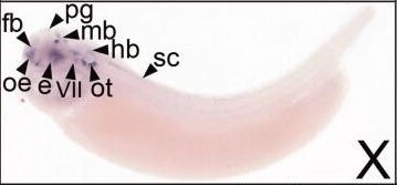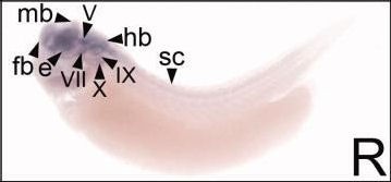 cacna1a ( calcium channel, voltage-dependent, P/Q type, alpha 1A subunit ) gene expression in Xenopus laevis embryo, assayed via in situ hybridization, NF stage 28, lateral view, anterior left, dorsal up. |