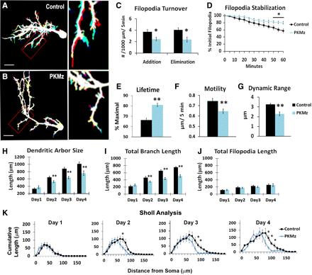 Figure 2. PKMz overexpression stabilizes dendritic filopodia and restricts arbor extension. A, B, Superimposed images of six successive time points (each a different color, with overlap = white) at 10 min imaging intervals of a neuron expressing exogenous PKMz (A) and a control neuron (B). Area within the boxed region is enlarged on the right. Scale bars, 20 μm. CâG, Morphometric analysis of dendritic filopodial dynamics of PKMz neurons (N = 6 cells; n = 269 filopodia) and control neurons (N = 7 cells; n = 255 filopodia). PKMz overexpression significantly decreases the rates of filopodial addition and elimination (C); increases the fraction of filopodia that persist for 1 h (D) and mean filopodial lifetime (E); decreases filopodial motility (F) and dynamic range (G). HâK, 3D morphometric analysis of tectal neurons expressing GFP alone (control, n = 12) and GFP with PKMz (n = 10) 1â4 d after electroporation. PKMz overexpression restricts daily addition of dendritic arbor size (H), attributable to decreased extension of branches (I) but not filopodia (J). K, 3D Sholl analysis of dendritic arbor complexity 1â4 d after transfection. *p < 0.05; **p < 0.01.