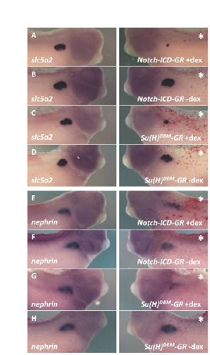 Fig. S2. Hormone-inducible Notch constructs produce the same pronephric phenotypes as non-inducible Notch constructs.X. laevis embryos were injected into a V2 blastomere with hormone-inducible notch-ICD-hGR mRNA and su(H)DBM-hGR mRNA, left to develop to stage 18 then incubated in culture medium containing dexamethasone and DMSO (induced), or just DMSO alone (non-induced). Embryos were then left to develop to stage 34 when whole-mount in situ hybridisation for nephrin and slc5a2 was performed. (A, B) Embryos injected with notch-ICD-hGR mRNA that was activated at stage 18 showed a reduction in slc5a2 expression (A), but in non-induced embryos, slc5a2 expression was not affected (B). (C, D) Similarly embryos injected with su(H)DBM-hGR mRNA that was activated at stage 18 had reduced slc5a2 expression (C), but when not incubated in dexamethasone, these embryos displayed no pronephric phenotype (D). (E, F) Embryos injected with notch-ICD-hGR mRNA that was subsequently activated at stage 18 had ectopic nephrin expression (E), but when not activated no glomus abnormalities were observed (F). When embryos injected with su(H)DBM-hGR mRNA had their message activated at stage 18, nephrin expression was reduced. (G) Non-activated su(H)DBM-hGR mRNA had no effect on nephrin expression. Inducible Notch constructs produce similar phenotypes to non-inducible constructs and therefore the non-inducible constructs used in this work have specific effects on early pronephrogenesis. Asterisk denotes injected side. |