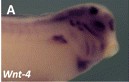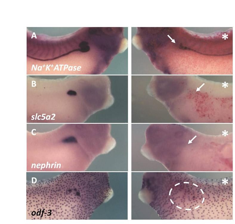 Fig. 2. wnt4 overexpression induces the same phenotypes as injection of notch-ICD mRNA. (A-E) X. laevis embryos were injected as previously described. wnt4 mRNA was co-injected with beta-galactosidase mRNA to act as a lineage tracer [blue (A); red (B-E) staining on the injected side]. At stage 41, 3G8 is ectopic (white arrows) and 4A6 is reduced on the injected side (A). At stage 36, Na+K+ATPase (B) and slc5a2 (C) expression is reduced upon wnt4 overexpression and at stage 32 odf3 (D) and nephrin (E) expression is ectopic (white arrows). Asterisk denotes injected side. |