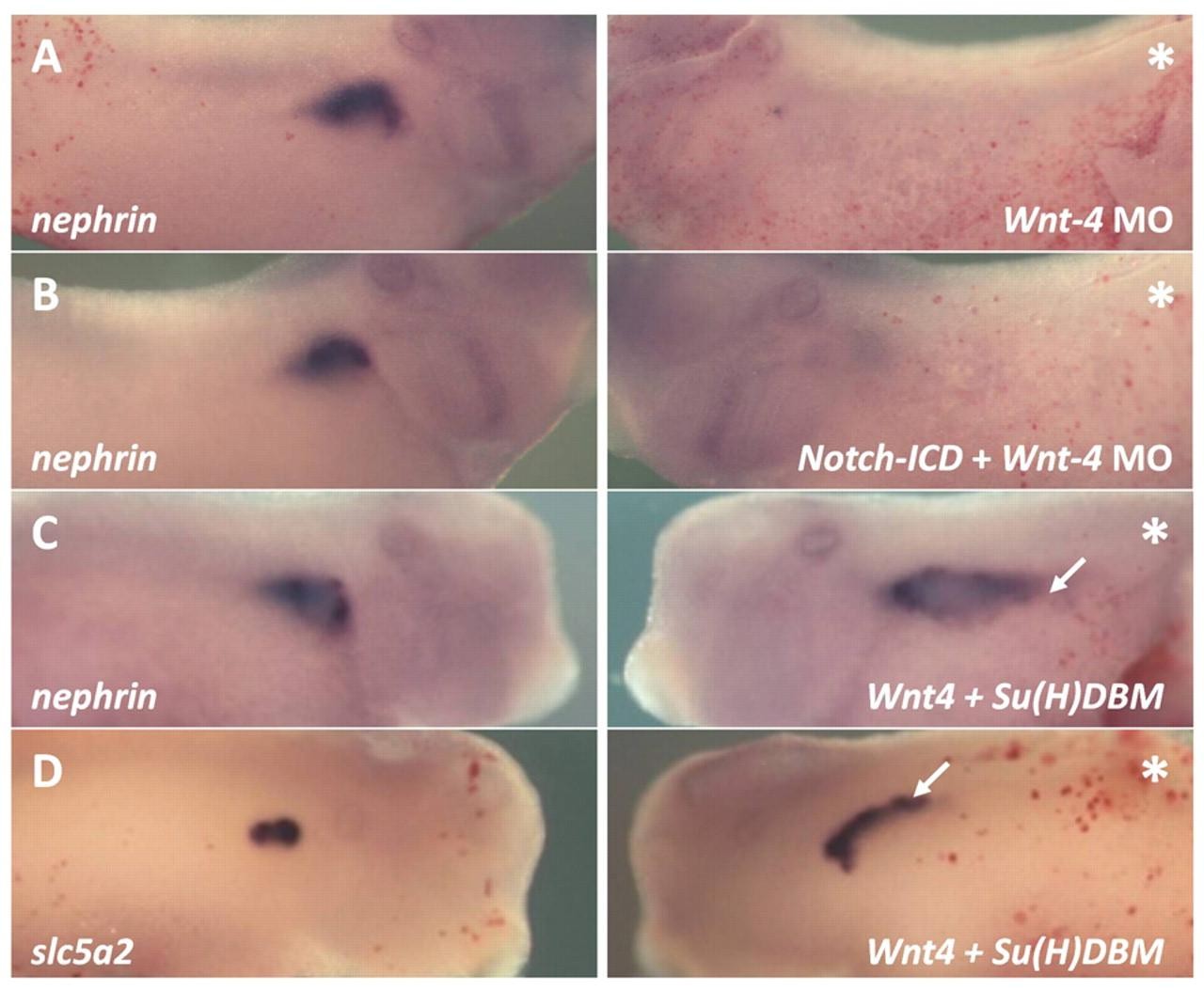Fig. 4. wnt4 acts downstream of the Notch pathway in the pronephros. (A-D) X. laevis embryos were injected as previously described and left to develop to stage 32, when in situ hybridisation detecting expression of nephrin and slc5a2 was performed. (A) Knockdown of wnt4 translation using a MO-inhibited nephrin expression. (B) Co-injection of notch-ICD mRNA and the wnt4 MO also reduces nephrin expression. Co-injection of su(H)DBM mRNA with wnt4 mRNA, causes ectopic glomus formation (white arrow, C) and proximal tubulogenesis (white arrow, D). Asterisk denotes injected side. |