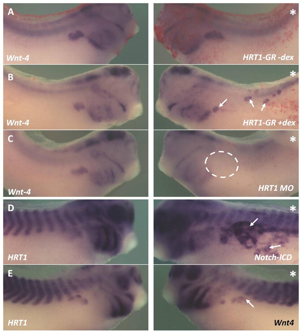 Fig. 5. hrt1 is induced by notch-ICD mRNA injection and promotes wnt4 expression. (A-E) X. laevis embryos were injected as previously described and left to develop to stage 28, when in situ hybridisation detecting expression of either wnt4 (A-C) or hrt1 (D,E) was performed. Embryos injected with hormone-inducible hrt1-hGR mRNA, but not incubated in dexamethasone to activate the message, have normal pronephric wnt4 expression (A). Embryos injected with hrt1-hGR mRNA but incubated in dexamethasone from stage 18 onwards, display ectopic wnt4 expression (B). MO depletion of HRT-1 inhibited wnt4 expression (C). Overexpression of notch-ICD causes a large increase in pronephric hrt1 expression (D), whereas hrt1 expression is largely unaffected by wnt4 mRNA injection (E). Asterisk denotes injected side. |