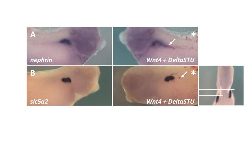 Fig. S3. Wnt-4 overexpression promotes glomus formation and proximal tubulogenesis when co-injected with DeltaSTU.X. laevis embryos were injected into a V2 blastomere with a combination of wnt4 mRNA and deltaSTU mRNA, then left to develop to stage 34 where whole mount in situ hybridisation for nephrin and slc5a2 expression was performed. wnt4 overexpression with concomitant inhibition of Notch signalling caused ectopic nephrin (A) highlighting that Wnt-4 acts downstream of Notch signalling in the proximal pronephros. In addition, slc5a2 expression is not significantly reduced by co-injection of wnt4 deltaSTU and frequently the expression domain of slc5a2 is more distal (see dorsal view of pictured embryo). Asterisk denotes injected side. |
