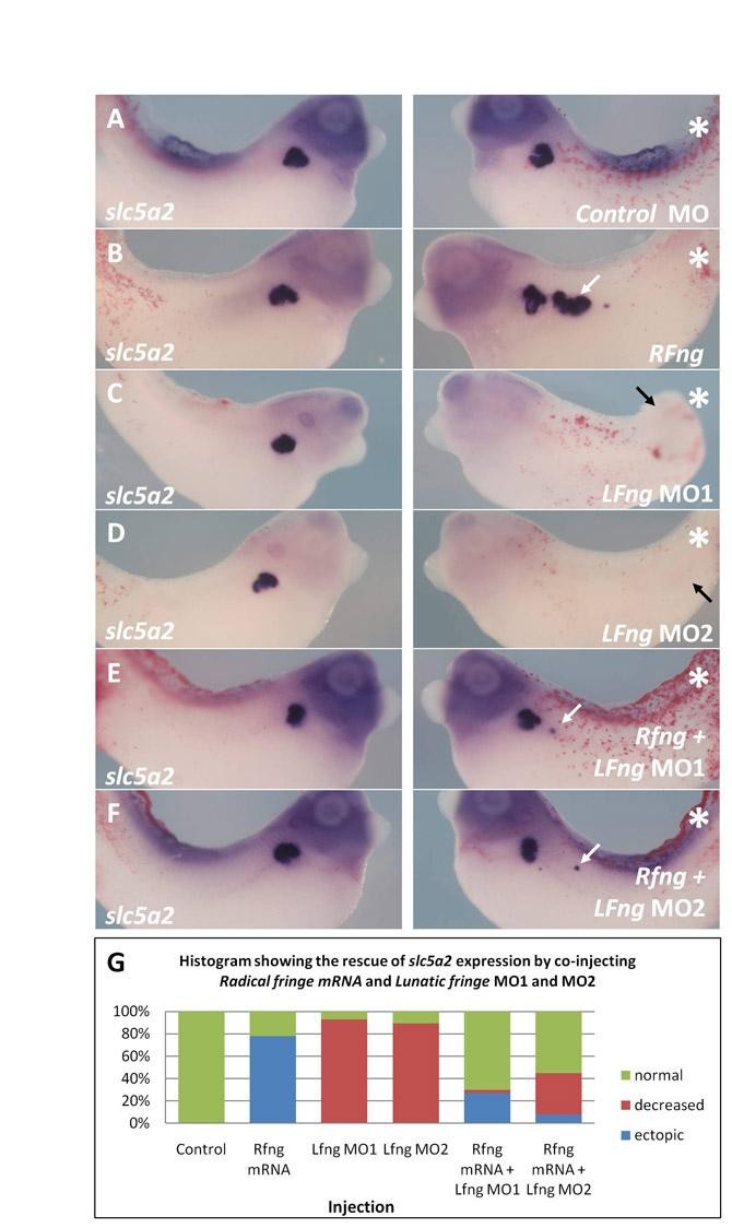 Fig. S5. lfng misexpression inhibits pronephros formation, knockdown of rfng translation has no effect on pronephrogenesis.X. laevis embryos were injected at the eight-cell stage into a ventro-vegetal blastomere to target the presumptive pronephric region, with beta-galactosidase mRNA to act as a lineage tracer (blue staining on injected side). (A-D) Embryos were cultured to stage 41, when they were fixed, stained for the lineage label and correctly targeted embryos were whole-mount antibody stained for epitopes in the nephrostomes and proximal tubules, detected by 3G8 (purple stain, white arrow), and intermediate and distal tubules, detected by 4A6 (red stain, dashed white arrow). Injection of a control MO in addition to beta-galactosidase mRNA had no effect on pronephros development (A and E). Injection of lfng mRNA (B), lfng MO1 (C) and lfng MO2 (D) inhibited pronephrogenesis, as observed by reduced 3G8 and 4A6 staining. Additionally, we have observed the effects of lfng mis-expression on slc5a2, nephrin and Na+K+ATPase expression and found all domains of the pronephros did not form (data not shown). Injection of the rfng MO had no effect on pronephrogenesis, 3G8 and 4A6 staining was normal on the injected side. We also did not detect any effect of Rfng depletion on slc5a2, nephrin and Na+K+ATPase expression, showing all pronephric compartments formed (data not shown). Asterisk denotes injected side. |