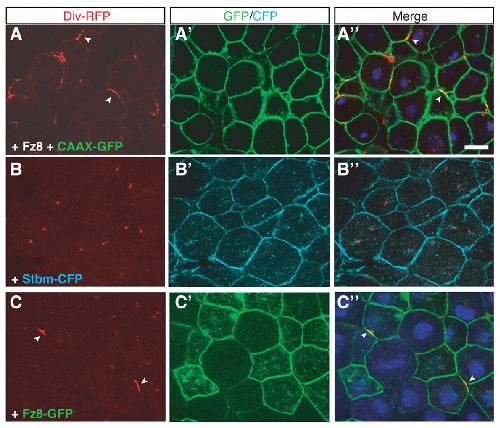 Fig.3. Non-uniform membrane recruitment of Diversin by Fz. (A-C) Animal cap explants were prepared from stage-10 embryos injected as described in Fig. 1A with the following RNAs: Div-RFP (0.5 ng), Fz8 (1 ng), Stbm-CFP (0.5 ng), CAAX-GFP (0.1 ng) and Fz8-GFP (1 ng). Diversin was recruited to the cell membrane in a non-uniform manner by Fz8 (A,C; arrowheads), but not by Stbm (B). The distribution of Fz8-GFP differed from the localization of Diversin (C). Note the uniform membrane localization of CAAX-GFP, Stbm-CFP and Fz8-GFP (A-C). Scale bar: 20 μm. |