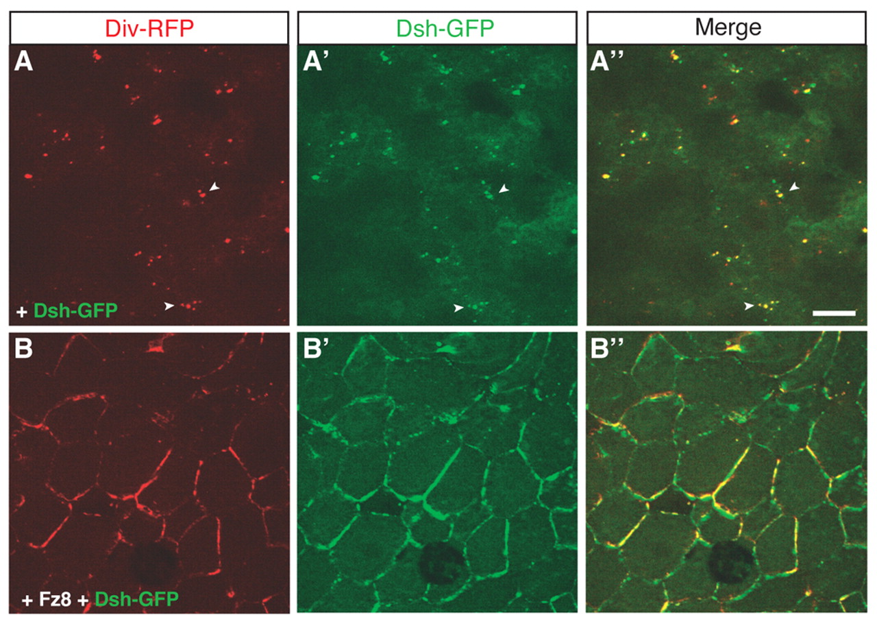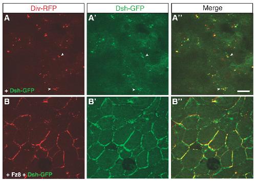 Fig.4. Colocalization of Diversin and Dsh. (A,B) Animal cap explants were prepared from stage-10 embryos injected with the following RNAs: Div-RFP (0.5 ng), Dsh-GFP (0.15 ng) and Fz8 (1 ng). Diversin colocalized with Dsh to cytoplasmic puncta (A, arrowheads), whereas Fz8 caused a non-uniform distribution of both Diversin and Dsh on the cell membrane (B). Scale bar: 20 μm. |
