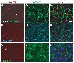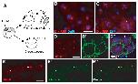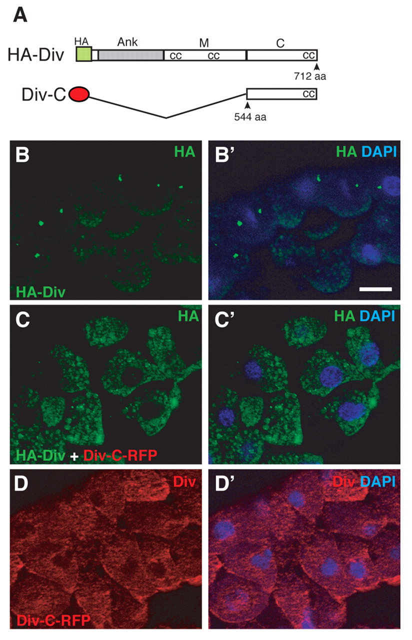 Fig.1. Overexpressed Diversin localizes to the centrosome in Xenopus ectoderm. (A) Experimental scheme. (B-E) Two animal blastomeres of eight-cell embryos were injected with 0.5 ng of Diversin-RFP (Div-RFP; B-D) or HA-Diversin (HA-Div; E) RNA alone or with 0.15 ng of CAAX-GFP RNA. At stage 10, the injected embryos were fixed for immunostaining on cryosections or used to prepare ectodermal explants. (B,C) In ectodermal explants, Div-RFP was distributed as a single dot in interphase cells (B) or two dots in mitotic cells (C). (D,E) In cryosections, Div-RFP was distributed in ectodermal cells at early gastrula stage as one or two dots per cell and colocalized with γ-tubulin (E). (D) CAAX-GFP stained with anti-GFP antibodies marks the cell membrane. RFP and DAPI co-staining is shown (B,C) or a merged image (Dâ²). Metaphase plates (C,Dâ²) or centrosomes (E) are indicated by arrowheads. Scale bars: 20 μm. Scale bar in B also applies to C. |