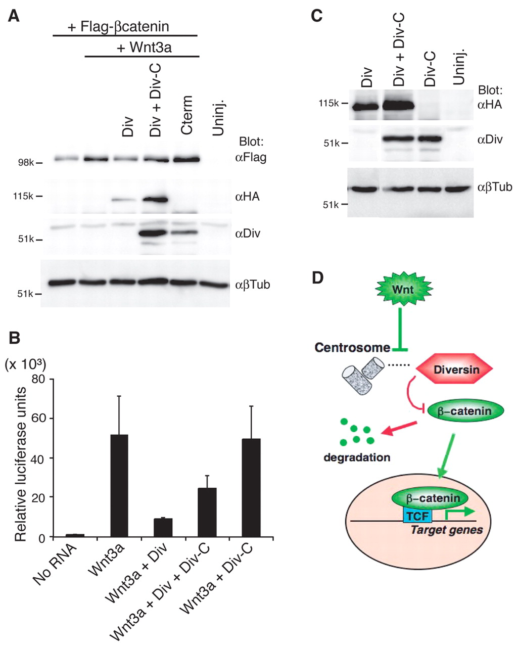 Fig.8. Div-C diminishes Wnt inhibitory activity of the wild-type Diversin. (A) Div-C suppresses the inhibitory effect of wild-type Diversin on β-catenin stabilization. RNAs injected were: Wnt3a (10 pg), HA-Diversin-RFP (0.5 ng), Div-CâRFP (1 ng) and FLAGâβ-catenin (30 pg). (A,C) After protein separation and transfer, transfer membranes were cut at approximately the 80-kD band level and separately probed with anti-HA antibody to detect overexpressed wild-type Diversin and with anti-Diversin antibody to detect Div-C (which has no HA tag). β-tubulin is a loading control. (B) Div-C diminishes the inhibitory effects of Diversin on Siamois reporter activation by Wnt3a. Luciferase assay with pSia-Luc DNA (20 pg) upon co-injection of 10 pg of Wnt3a RNA with 0.5 ng of HA-Div-RFP and 1 ng of Div-C-RFP into animal ventral blastomere of eight-cell embryos. Four groups of six embryos were collected at stage 10 for the reporter assay. Means ± s.d. are shown. (C) Diversin and Div-C expression levels in embryos used for B. (D) Model for Diversin function at the centrosome. Centrosomal Diversin promotes β-catenin degradation. Upon Wnt signaling, Diversin is redistributed to punctate structures at the cell cortex and the cytoplasm, resulting in stabilized β-catenin and increased target gene transcription. |