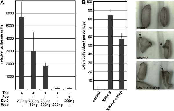 Wtip is a LIM domain protein of the Ajuba/Zyxin family involved in kidney and neural crest development; Ror2 is a receptor tyrosine kinase involved in the development of skeleton, heart, lung, genitalia and kidneys. Here we describe Wtip as an intracellular interaction partner of Ror2. Full-length Ror2 recruits Wtip to the cell membrane, a mutant involved in human disease fails to do so. Both genes and proteins show overlapping expression in the mouse embryo. We show that Wtip is able to inhibit canonical Wnt signalling in mammalian cells and in Xenopus embryos linking Wtip to a crucial developmental pathway.