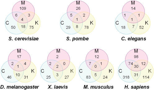 Figure 3. The statistics of localization distributions of microkit proteins from seven organisms, separately.