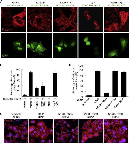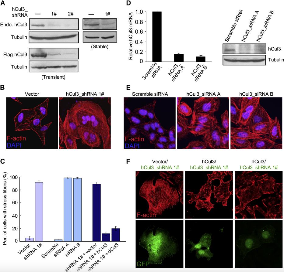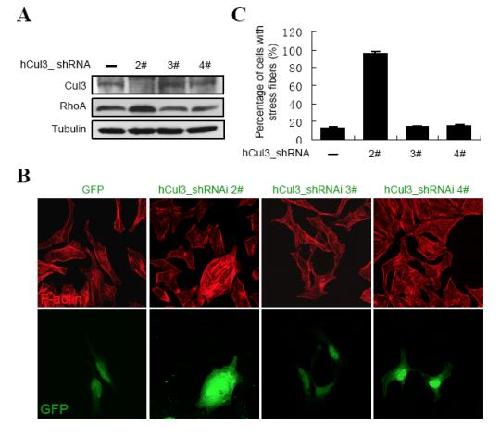 Figure S1. Effects of Additional hCul3-Targeting shRNAs on Stress Fiber Formation and RhoA Accumulation. (A) Immunoblotting analysis of HeLa cells transfected with hCul3_shRNA 2#, 3#, or 4# using indicated antibodies. (B) Staining of HeLa cells transfected with indicated hCul3 shRNA plasmid. F-actin stained with Rhodamine-Phalloidin is in red and GFP marks the RNAi cell. (C) Statistics of HeLa cells showing actin stress fibers in (B). All the data represent mean ± SD (error bar) of three independent determinations. At least 200 GFP-positive cells were counted for each experiment |