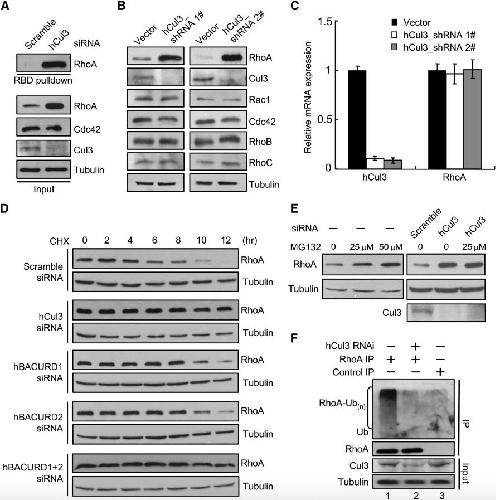 Figure 3. Impaired Ubiquitination and Degradation of RhoA in Cul3 RNAi Cells (A) RBD pull-down assays of RhoA-GTP. HeLa cells transfected with scramble siRNA or hCul3_siRNA A were lysed, and RhoA-GTP was precipitated by GST-RBD and analyzed by RhoA immunoblotting (RBD pull-down, upper panel). Immunoblotting of indicated total protein levels is shown in the lower panels (input). (B) Effects of Cul3 knockdown on protein levels of endogenous Rho family GTPases. HeLa cells were transfected with indicated Cul3_shRNA plasmid or a control empty vector, and the total cell lysates were immunoblotted using antibodies as indicated. (C) qRT-PCR measurements of the mRNA level of Cul3 and RhoA in Cul3 RNAi cells. Indicated hCul3_shRNA plasmid or a control empty vector was transfected into HeLa cells. The left three columns are relative mRNA levels of Cul3, and the right three columns correspond to those of RhoA. The mRNA level of GAPDH was used for normalization. All the reactions were performed in triplicates, and shown are mean values ± SD (error bar) from three independent experiments. (D) Stability of endogenous RhoA in hCul3 and hBACURD knockdown cells. HeLa cells were transfected with indicated siRNAs (hCul3_siRNA A, hBACURD1 siRNA 1#, and hBACURD2 siRNA 1#) (see Table S2). Cells were lysed at the indicated time after cycloheximide (CHX) treatment, and shown are RhoA and tubulin immunoblots of total cell lysates. (E) Effects of MG132 treatment on RhoA protein level in hCul3 knockdown cells. Intact HeLa cells (left) or HeLa cells transfected with scramble siRNA or hCul3_siRNA A (right) were treated with DMSO (0) or MG132 at the indicated concentration for 4 hr prior to cell lysis. Immunoblots of total cell lysates are shown. (F) Immunoblotting assays of effects of Cul3 knockdown (hCul3_siRNA A) on in vivo ubiquitination of RhoA. Endogenous RhoA was immunoprecipitated under denaturing conditions from MG132-treated HeLa cells using RhoA or a control antibody. The immunoprecipitates were analyzed by anti-ubiquitin (Ub) and anti-RhoA (RhoA) immunoblotting. RhoA-Ub(n) denotes polyubiquitinated forms of RhoA. The lower two panels show knockdown of Cul3 and a tubulin loading control. |