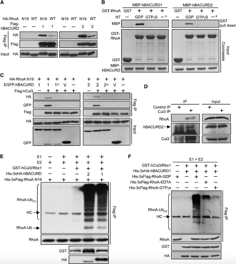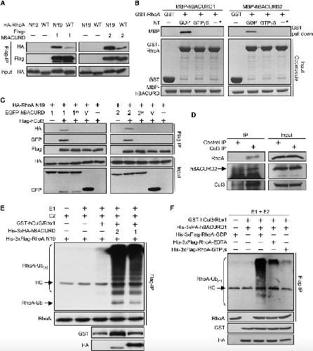 Figure S13. Interactions between RhoA and hBACURD Deletion Mutants Full-length Flag-hBACURDs, or Flag-ÎBTB (amino acids 184-329 for hBACURD1 and 171-310 for hBACURD2), or Flag-BTB (amino acids 1-168 for hBACURD1 and 1-155 for hBACURD2) were co-transfected together with HA-RhoA N19 into 293T cells and cell lysates were subjected to Flag immunoprecipitations. The upper two panels are anti-Flag and anti-HA blots of the immunoprecipitates and the low panel shows anti-HA blots of the total RhoA N19. |