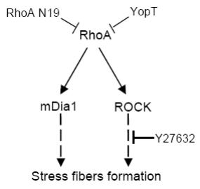 Figure S2. Diagram of the RhoA Pathway Controlling Actin Stress Fiber Assembly RhoA N19 is a dominant-negative mutant, and YopT is a cytotoxin that proteolyzes and inactivates RhoA. Y27632 is a potent ROCK inhibitor. |