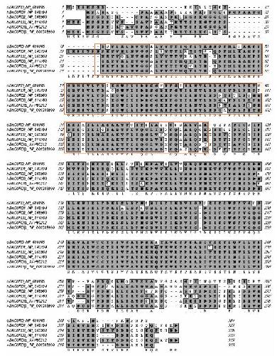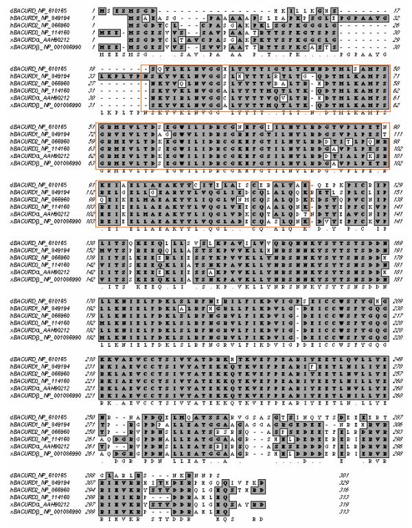 Figure S9. Sequence Alignment of the BACURD Family of BTB Proteins The BACURD family was identified by BLAST searches using the protein sequence of Drosophila gene CG10465 (renamed as dBACURD) and aligned using the ClustalW program. The BACURD family is conserved from Drosophila to higher eukaryotes, and included in the alignment are the BACURD family members from Drosophila (dBACURD), Xenopus laevis (xBACURDα and xBACURDβ), and human (hBACURD1, hBACURD2 and hBACURD3). Homologous sequences from other eukaryotes including mice are omitted in the alignment due to the space limitation. The accession number is listed following the name of each protein. Conserved residues are shaded in grey. Sequences in the red box highlight the BTB domain. |