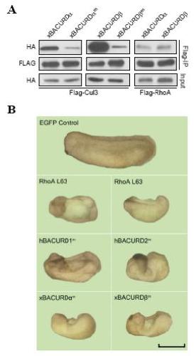 Figure S18. Effects of Dominant-Negative Mutants of BACURDs on Xenopus Gastrulation (A) Coimmunoprecipitation of xBACURDs with Cul3 and RhoA. HA-xBACURDs (WT or mutants) were co-transfected into 293T cells with FLAG-Cul3 or Flag-RhoA N19. xBACURDαm and xBACURDβm denote the xBACURDα I74A/L75A/I76A and xBACURDβ I75A/L76A/I77A triple mutant, respectively. Flag immunoprecipitates (upper and middle panels) or total extracts (lower panels) were blotted with indicated antibodies. (B) Effects of dominant negative mutants of BACURDs on Xenopus gastrulation. Embryos at stage 26 were examined. Embryos were injected at the 2-4 cell stage with EGFP mRNA alone, EGFP plus RhoA L63 (0.2 ng) mRNAs, or EGFP plus indicated BACURD mutant mRNAs (8 ng each). Statistics of embryos showing different phenotypes are detailed in Table S1. |