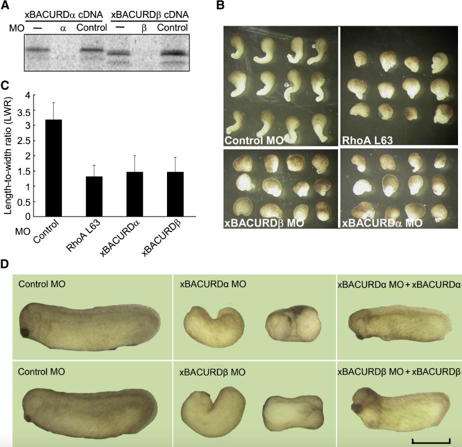 Figure 7. The Cul3/BACURD Complex Is Essential for RhoA-Mediated Convergent Extension Cell Movement during Xenopus Gastrulation (A) Suppression of in vitro translation of xBACURD mRNA by Morpholino. Indicated xBACURDs were in vitro translated in the presence of specific or control Morpholino oligos (MOs). Shown is the autoradiography of in vitro translation products. (B and C) The Keller explant assay of convergent extension. Indicated xBACURD MOs or RhoA L63 mRNA was injected into 2- to 4-cell-stage Xenopus embryos, and the Keller explants were removed when the injected embryos reached the early gastrula stage (stage 10â10+). Shown in (B) are representative images of in vitro cultured explants at stage 20. The length of the longest aspect and the width of constriction point of each explant were measured, and statistics of the length-to-width ratio (LWR) are shown in (C). Significant differences among explants were calculated by using the Student's t test (p < 0.05). Error bar indicates SD. (D) Effects of xBACURD Morpholino on Xenopus embryo development and rescue analysis. Xenopus embryos at stage 26 were examined after injection of 2- to 4-cell-stage embryos with a control MO (left panels), indicated xBACURD MO (middle panels), or the indicated combination of xBACURD MO and excessive MO-resistant xBACURD mRNAs (right panels) (4 ng and 1 ng mRNA for xBACURDα and xBACURDβ, respectively). The amount of MO injected for each embryo is about 4.2 pM. Statistics of embryos showing different gastrulation phenotypes are detailed in Table S1. |