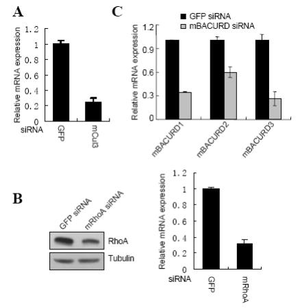 Figure S16. Knockdown of mCul3, mBACURDs, and mRhoA in MEF Cells (A) qRT-PCR measurements of mRNA expression of mCul3 in MEF cells treated with GFP siRNA or mCul3-specific siRNA. Error bar indicates SD. (B) Immunoblotting analysis (left panel) and qRT-PCR measurements of mRhoA mRNA (right panel) in MEF cells treated GFP siRNA or mRhoA-specific siRNA. (C) qRT-PCR measurements of mRNA expression of mBACURDs in MEF cells treated with GFP siRNA or indicated mBACURDs siRNAs. Error bar indicates SD. |