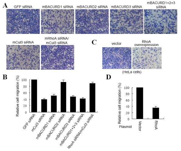 Figure S17. Boyden Chamber Assays of Migration Potential of Cul3 and BACURD Knockdown MEF Cells and RhoA âoverexpressing HeLa Cells (A and B) MEF cells treated with indicated siRNAs or siRNA combinations. (C and D) HeLa cells transfected with an empty vector or a RhoA-expressing plasmid. The assay was performed and data are presented similarly as those in Figure 6A (for A and C) and in Figure 6B (for B and D). Error bar indicates SD. |