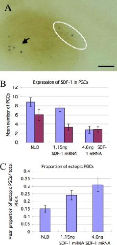 Fig. 5. Expressing SDF-1 in PGCs reduced the numbers of PGCs reaching the genital ridge and increased the ratio of ectopic PGCs to total PGC numbers. SDF-1 mRNA fused with the DEADSouth 3â²-UTR was co-injected with NLD mRNA into one of the vegetal blastomeres of 32-cell stage embryos. Embryos were fixed at stage 46, stained and scored. (A) Bleached and cleared embryos were observed using a stereomicroscope. PGCs were identified by their blue nuclei (white ellipse). Ectopic PGCs are indicated by arrows. Bar = 200 μm. (B) Effect of injected SDF-1 mRNA on the number of successfully migrating PGCs. The bar chart shows the results of two independent experiments, illustrated in different colors. In each bar chart, the vertical axis represents the mean number of PGCs per embryo and the horizontal axis shows the quantity of mRNA injected. The bars show the standard error. (C) Effect of injected SDF-1 mRNA on the proportion of ectopic PGC to total PGC numbers. Data are listed in Table 4.