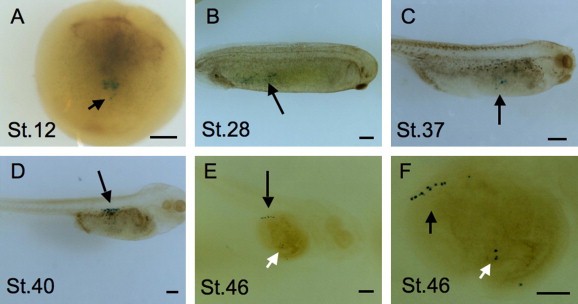 Fig. 1. Visualizing PGCs. NLD mRNA (mRNA coding for LacZ with its 3â²-UTR fused with that of DEADSouth) was injected into single vegetal blastomeres of 32-cell stage embryos and fixed at stages (St.) 12 (A), 28 (B), 37 (C), 40 (D) and 46 (E), followed by x-gal staining. Bleached and cleared embryos were observed using a stereomicroscope. PGCs were identified by their blue nuclei (black arrows). (F) A higher magnification of (E). At stage 46, almost all the PGCs had reached the genital ridge. However, as shown by the white arrows, a few remained in the endoderm and were designated âectopic PGCsâ. Bar = 200 μm.