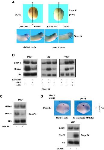 Fig. 2. The p38MAPK pathway is involved in the early expression of Nkx2.5. (A) One of two blastomeres (upper panel) or two of two blastomeres (lower panel) were injected with p38α AMO, and the expression of Nkx2.5 and GATA4 was detected by in situ hybridization of stage 13 (top) and stage 33 (bottom) embryos. (B) p38α AMO was injected to embryos, and gene expression was assessed in three cardiac explant assays; DMZ explants (left), AC explants from Alk4-expressing embryos (middle) and VMZ explants from LiCl-treated embryos (right). At stage 15, total RNA was isolated and RT-PCR analysis was performed. (C) Transcripts encoding inactive MKK6 (MKK6A) were injected to one cell embryos, and DMZ explants (n = 18) were isolated and were grown to stage 15. Total RNA was isolated and RT-PCR analysis was performed. (D) Upper panel: Transcripts encoding MKK6E were injected to one of two blastomere embryos (n = 24). Embryos were allowed to develop to stage 14 and in situ hybridization was performed with a probe to Nkx2.5. The injected side was recognized by the staining of a β-Gal lineage tracer. Lower panel: Transcripts encoding MKK6E were injected to one cell embryos, VMZ explants (n = 18) were isolated and were grown to stage 14. Total RNA was isolated and RT-PCR analysis was performed.
