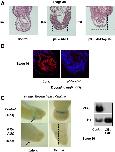 Fig. 1. Knockdown of p38α prevents heart development. (A) Anterior transverse sections of stage 38 control embryos with ventralheart structures, embryos injected with p38α AMO missing heart structures and embryos injected with p38α AMO and a transcript encoding mouse p38α with some heart structures. Sections were hematoxylinâeosin stained. (B) Anterior transverse sections of stage 46 control embryos or of embryos injected with p38α AMO. Sections were immunostained with antibodies to Troponin I (red) and counterstained with TO-PRO-3 (nuclear, blue). (C) Left panel: In situ hybridization staining of stage 30 embryos with a probe detecting myosin heavy chain α. At the two-cell stage, one blastomer was injected with p38α AMO (n = 38). Control group (n = 34) was not injected. Right panel: Embryos were injected with p38α AMO, DMZ explants (n = 18) were isolated and grown to stage 30. Total RNA was isolated and RT-PCR analysis was performed.