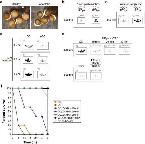 Figure 3. Caspases are rapidly activated in response to cytochrome c; caspases remain active for hours although their activity is only required for 10 minutes to ensure apoptosis(A) Oocytes were injected with yCC (healthy) or CC (apoptotic) at 106 nM, and photographed 3 hours later. (B) Oocytes microinjected with IRDye and either yCC or CC at 67 nM were imaged for fluorescence after 5 minutes, demonstrating rapidity of the signal in response to even small amounts of CC. Average oocyte fluorescence is displayed in Supplemental Figure 1e. (C) Oocytes microinjected with IRDye and either yCC or CC at 533 nM were imaged after 24 hours, demonstrating a stable, selective induction of signal in CC-injected oocytes even at high yCC concentrations. Average oocyte fluorescence is displayed in Supplemental Figure 1f. (D) Oocytes microinjected with either CC or yCC at 80 nM at t=0 were then injected with IRDye at various times indicated, and imaged 30 minutes later. Average oocyte fluorescence is displayed in Supplemental Figure 1g. (E) CC or yCC was microinjected at 533 nM at t=0, then IRDye and z-VAD-fmk (70 nM) were injected at times indicated and then imaged 30 minutes later. Note z-VAD-fmk-mediated signal inhibition even at high concentrations of CC. Average oocyte fluorescence is displayed in Supplemental Figure 1h. (F) Survival curve based on observation of apoptotic morphology of oocytes that had been treated as described in E.